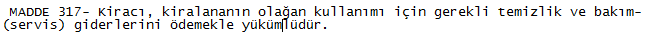 Burada da şu anlamı çıkarıyoruz. 317 madde diyor ki kiracı kombinin bakımını temizliğini yaptırmak zorundadır. Kombi bakımı yılda bir kez yapılmalıdır. Eğer kiracı 1 yıllı süre içerisinde kombinin bakımını yaptırmadı ise arızalanan cihazdan sorumludur.